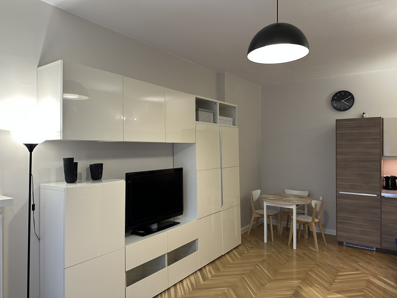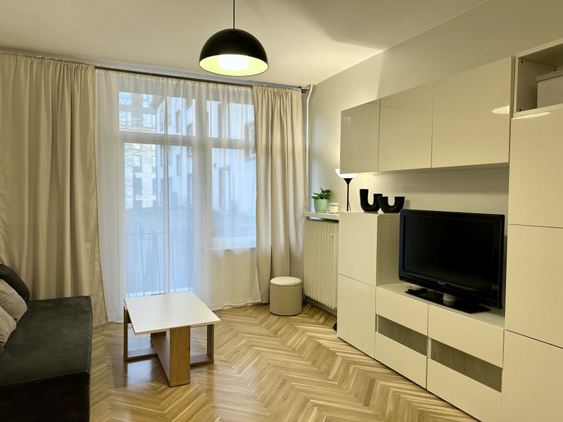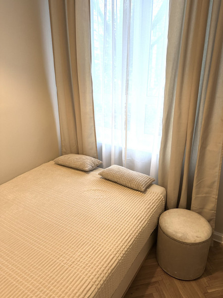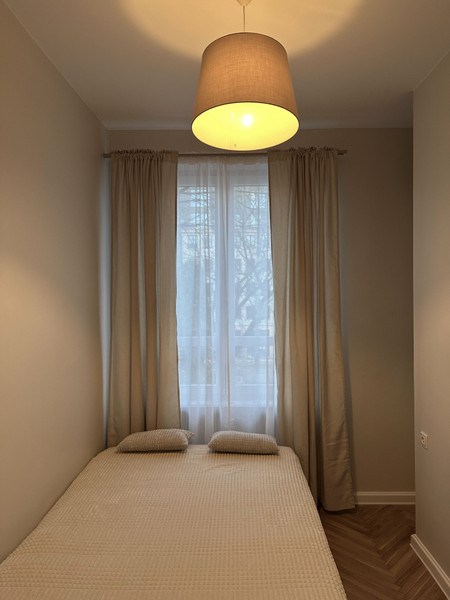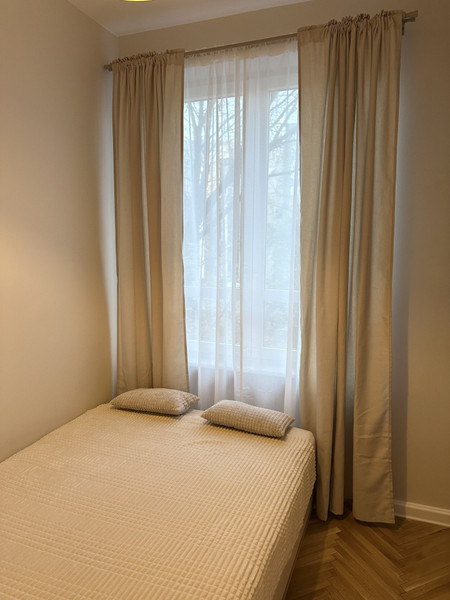 I p. 36 m2, sypialnia, salon z aneksem kuchennym – w pełni wyposażona kuchnia, przedpokój, łazienka, balkon, umeblowane, sprzęt AGD, ogrzewanie miejskie. Widok z okna na teren zielony.