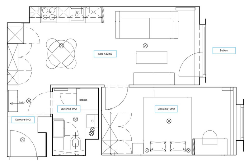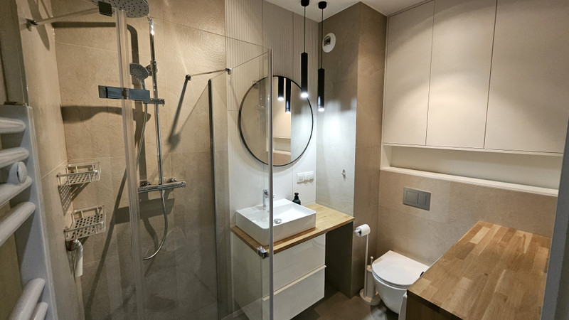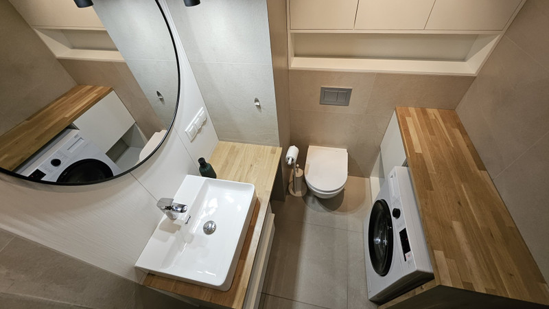 4. Łazienka - kabina prysznicowa, WC, umywalka, lustro, pralka, szafki na wymiar