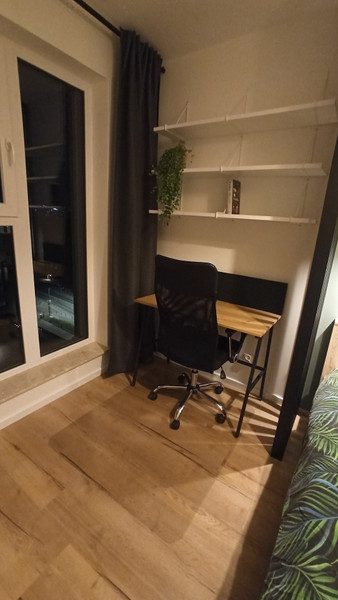 3. Sypialnia - łóżko z materacem 160x200, beżowa duża szafa na ubrania, stolik nocny, lampki nocne, biurko, krzesło do komputera, półki nad biurkiem, zasłony zaciemniające