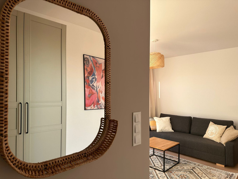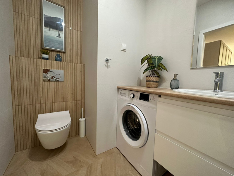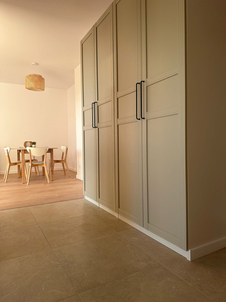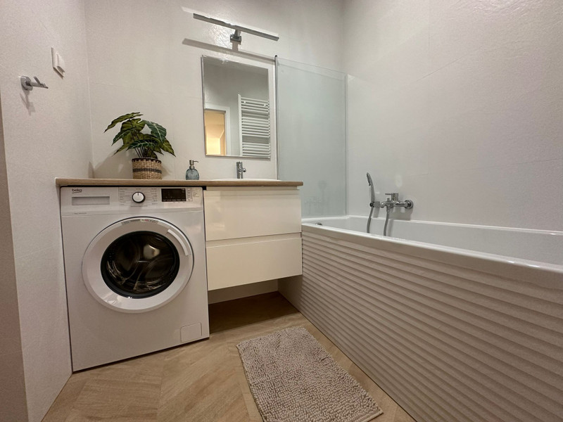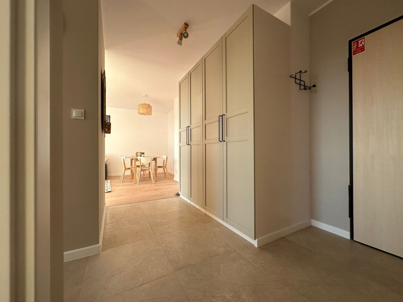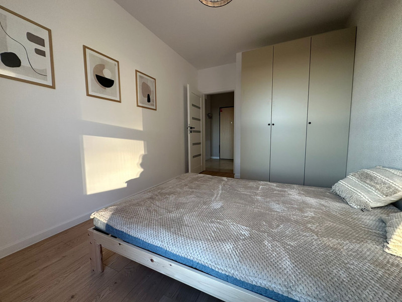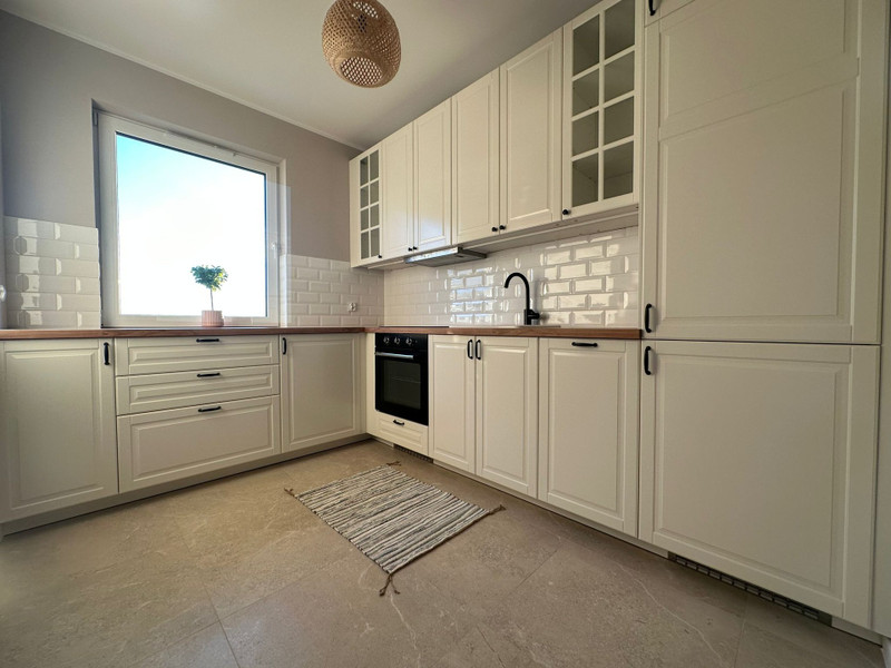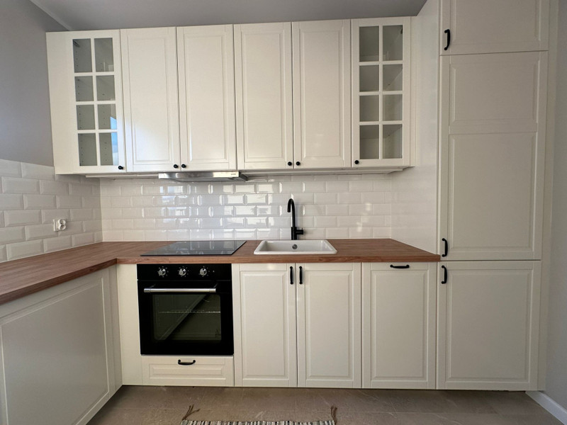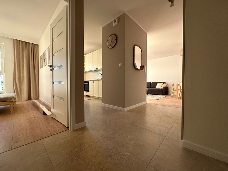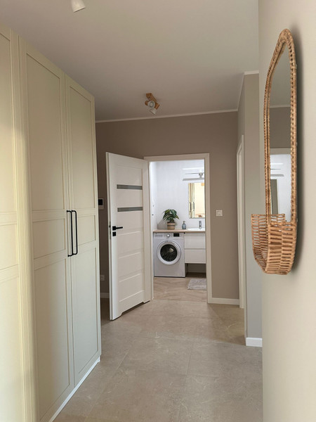 Mieszkanie ma niemal 51 m2 i składa się składa się z przedpokoju z dużą szafą, umeblowanej sypialni z szafą, salonu z balkonem i osobnej kuchni w pełni wyposażonej w meble i sprzęt AGD (duża lodówka, piekarnik, płyta indukcyjna, zmywarka). W salonie znajduje się również rozkładana sofa oraz stół z krzesłami. Łazienka jest kompleksowo wykończona z wanną i wyposażona w pralkę.