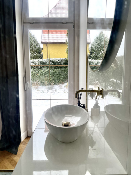 The fenced villa is situated on an elevated, quiet street with minimal traffic, surrounded by forest. The area offers privacy and open views, while the centre of Wrzeszcz, shopping centres, and the train station are all close by.