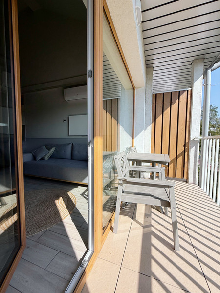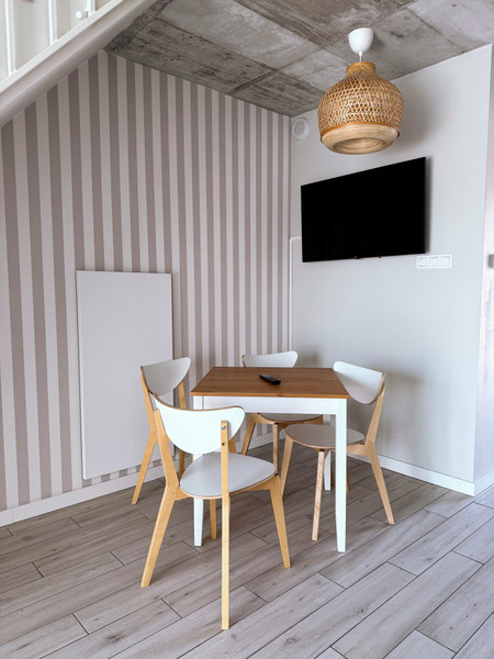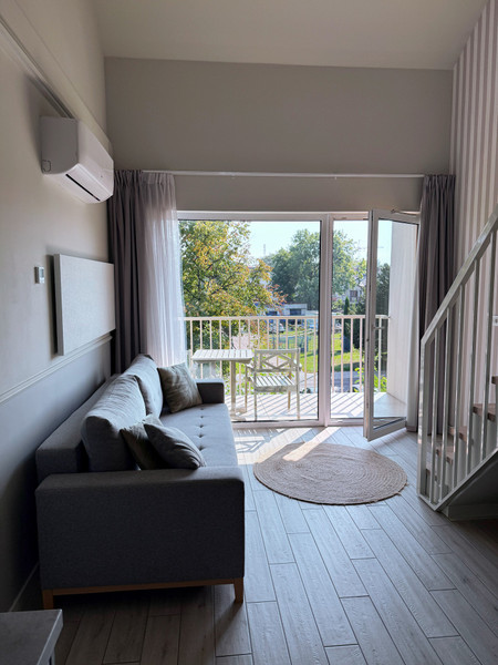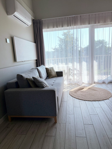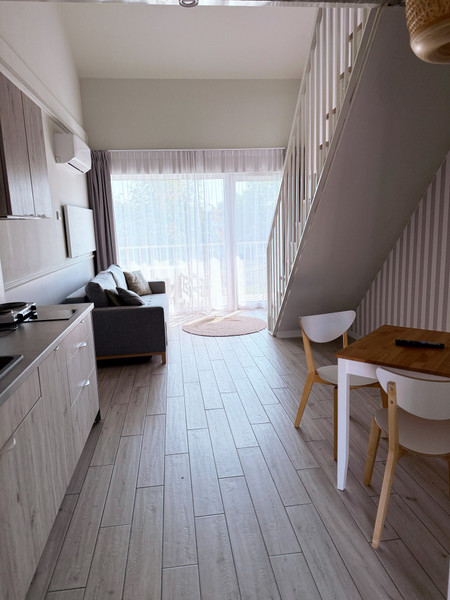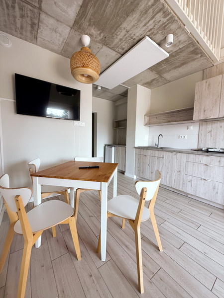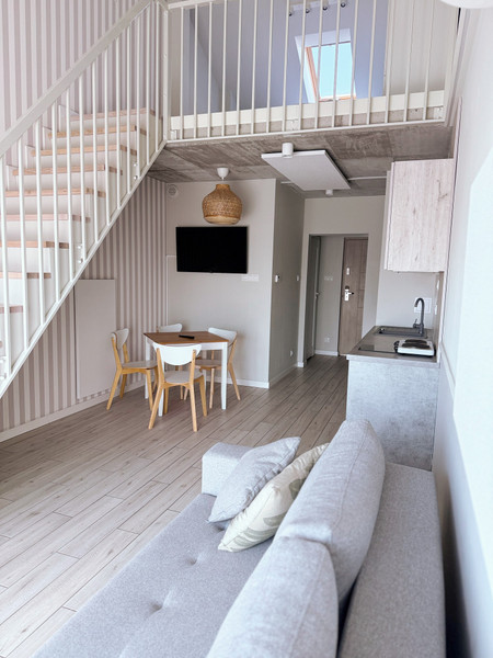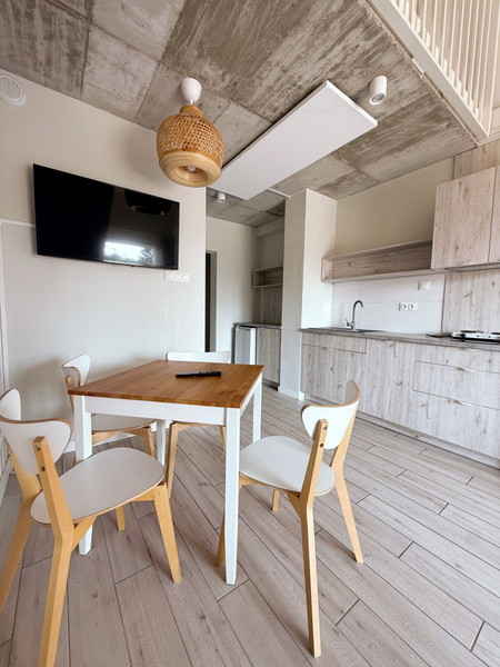 • jasny salon z aneksem kuchennym i wyjściem na balkon,