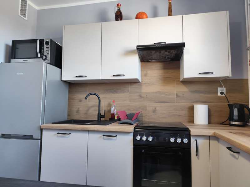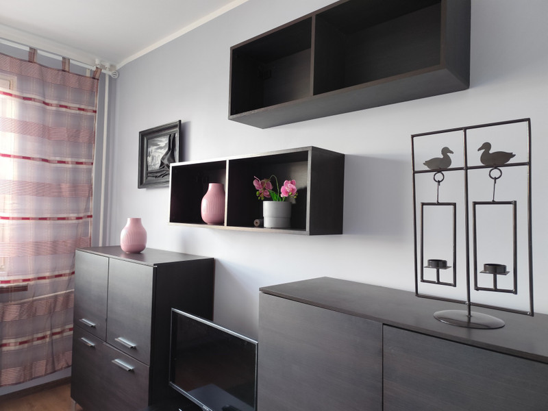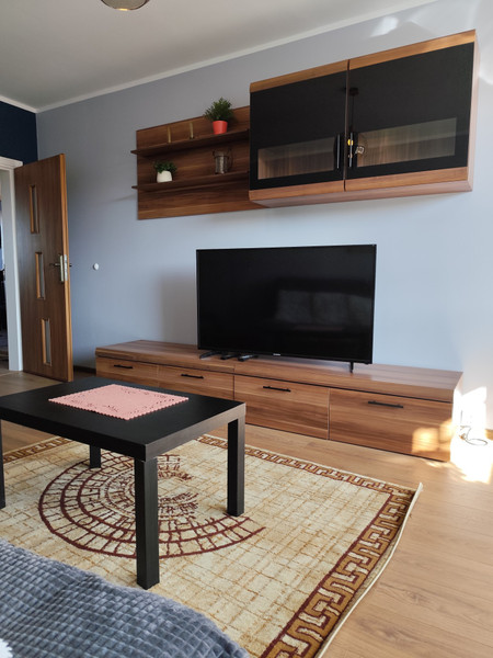 Mieszkanie składa się z dwóch pokoi Kuchni łazienki i przedpokoju.. Z salonu wyjście na balkon. Wyposażone jest w niezbędne sprzęty elektroniczne : pralka, lodówka, kuchenka gazowo-elektryczna, okap, zmywarka do naczyń, odkurzacz.