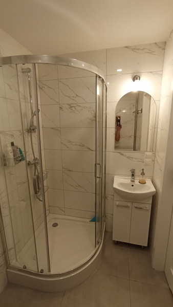 Łazienka: kabina prysznicowa, umywalka oraz pralka.