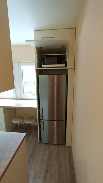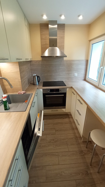 Kuchnia: lodówka, płyta indukcyjna, piekarnik, czajnik elektryczny, mikrofalówka, zmywarka, okap, na wyposażeniu znajdują się garnki, zastawa stołowa oraz sztućce.