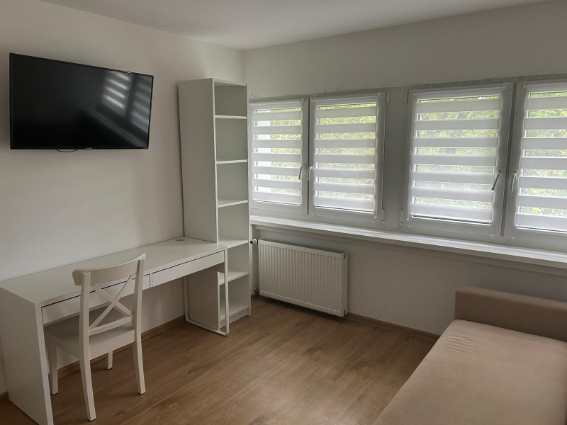 W pokoju znajduje się rozkładana sofa, biurko, komoda, regał oraz TV.