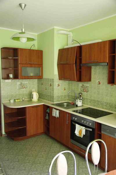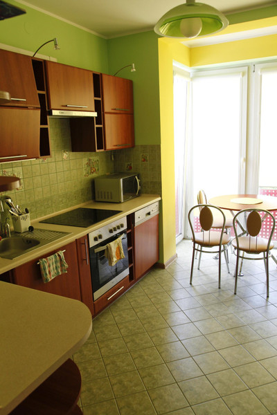Kuchnia osobna, bardzo widna w pełni umeblowana, wyposażona w płytę ceramiczną, piekarnik, lodówkę z zamrażarką, okap z pochłaniaczem, mikrofalówkę, czajnik elektryczny, naczynia, sztućce, garnki.