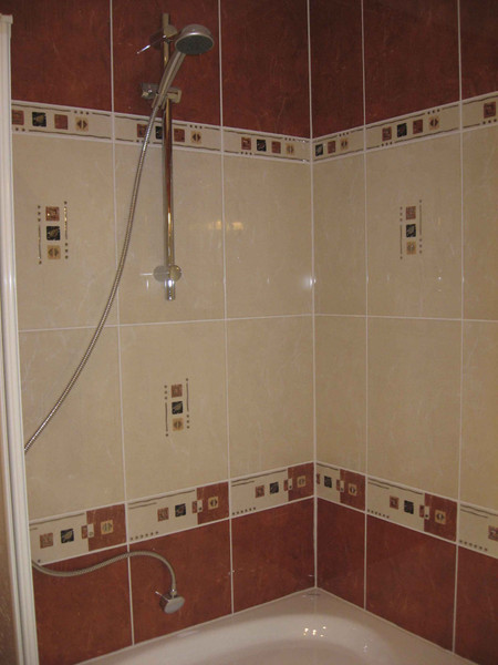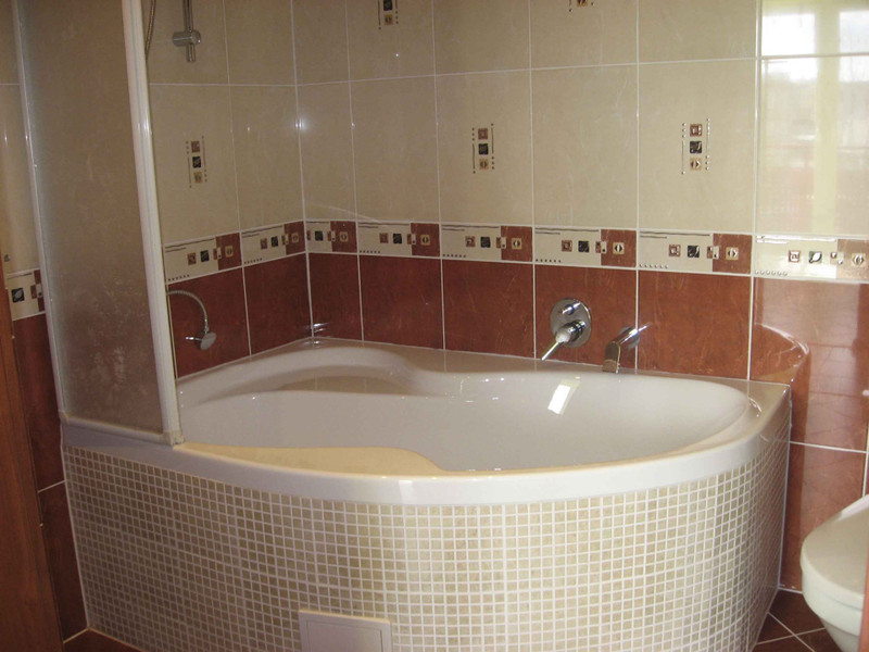 W łazience z WC wanna narożna z szybą prysznicową oraz prysznicem, umywalka, szafki łazienkowe, pralka. Na wyposażeniu deska do prasowania, żelazko, suszarka na pranie.