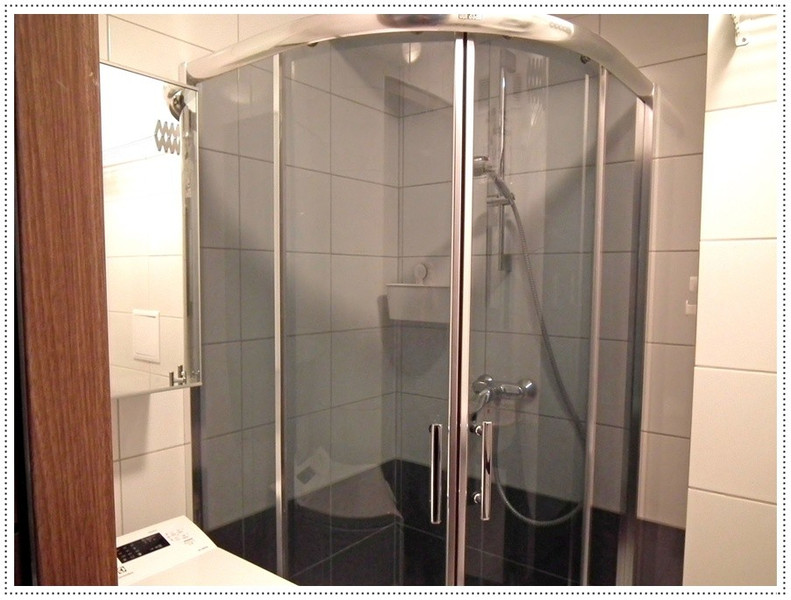 Łazienka: kabina prysznicowa, pralka, suszarka ścienna, dwie szafki z lustrem, zlew z szafką.