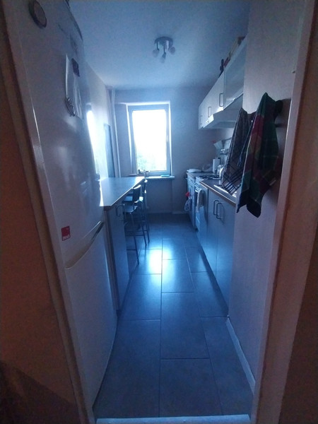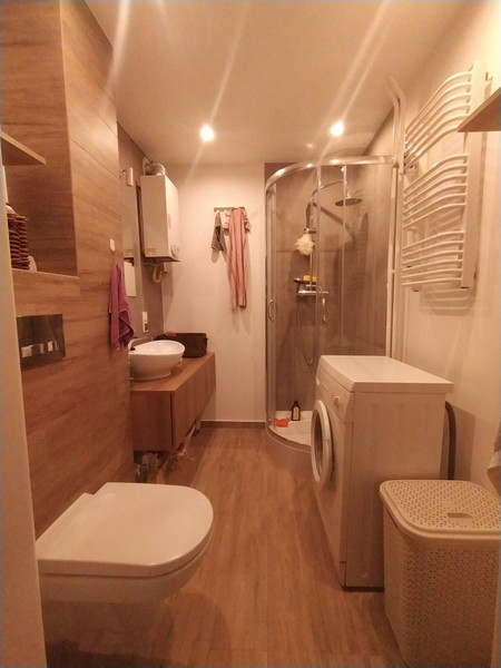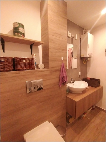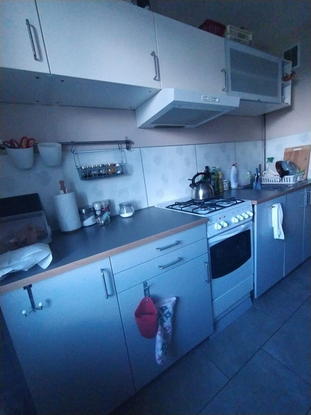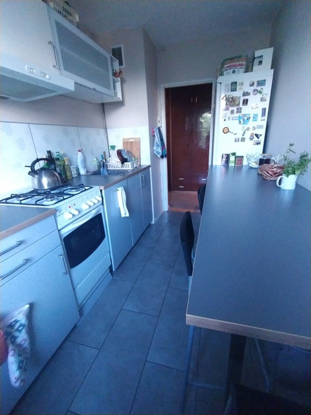 W mieszkaniu znajduje się w pełni wyposażona kuchnia (kuchenka gazowa z piekarnikiem elektrycznym, zmywarka, spory blat z krzesłami), oraz łazienka po gruntownym remoncie kilka lat temu (ciepła woda z sieci miejskiej).