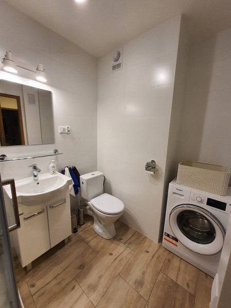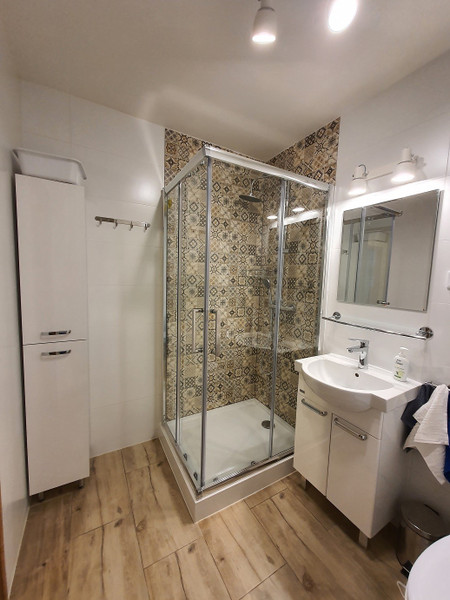 - łazienka z prysznicem, wc, pralka, szafki