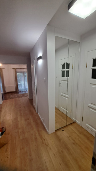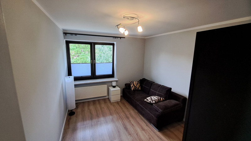 Umeblowany: duża szafa z lustrem, Wygodna rozkładana sofa 140×200 cm, komoda, szafka nocna, lampka.