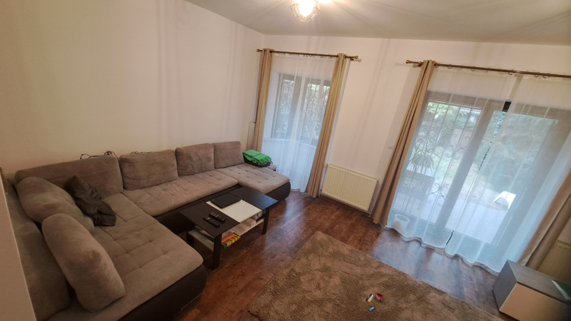 * Duży salon z sofą, TV i wyjściem na ogród,