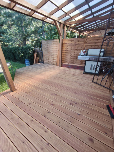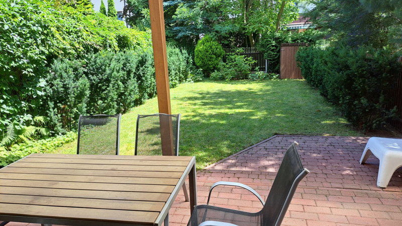 * Ogród z zadaszonym tarasem, miejscami do siedzenia i grillem gazowym