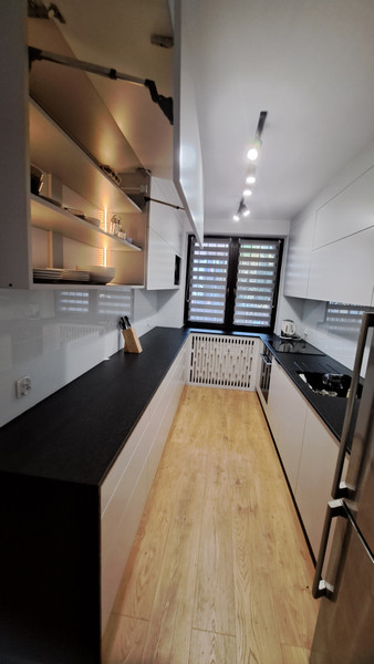 * Nowoczesna kuchnia kompletnie wyposażona z jadalnią (blat granitowy, pełne wyposażenie: płyta, piekarnik, mikrofala, duża lodówka, stół, krzesła),