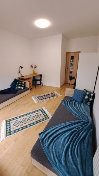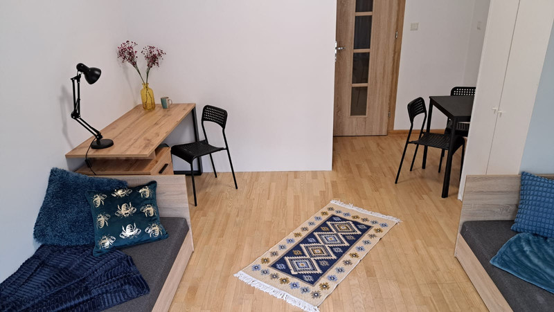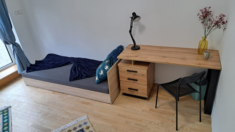 Pokój umeblowany i gotowy do zamieszkania. Na wyposażeniu pokoju jest łóżko, biurko z krzesłem i oświetleniem, szafa ubraniowa. Możliwość dostawienia kolejnego łóżka.