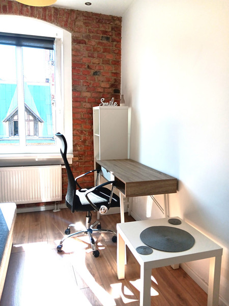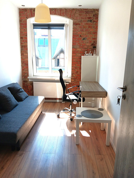 Pokój w wyremontowanym mieszkaniu, przytulny, w pełni umeblowany (łóżko, regał, szafa dwudrzwiowa, biurko, krzesło obrotowe oraz stolik), zamykany na klucz;