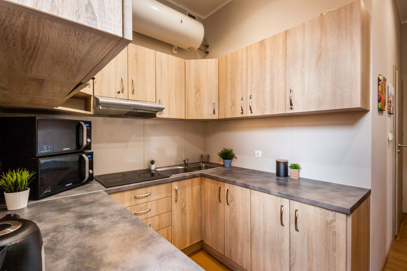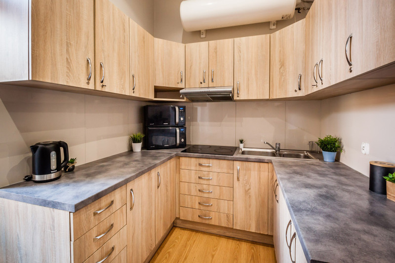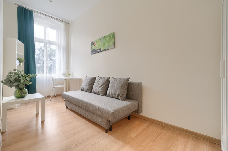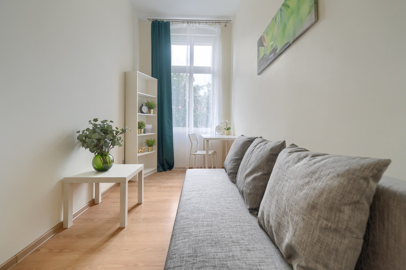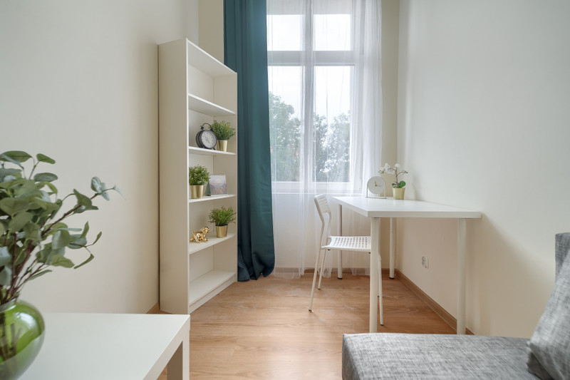 Pokój w pełni umeblowany w łóżko, szafę, regał na książki, biurko i krzesło. W mieszkaniu niezbędny sprzęt AGD - lodówka, pralka, odkurzacz, żelazko, mikrofalówka, płyta elektryczna oraz niezbędne wyposażenie kuchni – patelnie, garnki, sztućce, zastawa stołowa, durszlak etc. Oprócz tego suszarka na ubrania i deska do prasowania. W całym mieszkaniu jest dostęp do darmowego WIFI. Każdy pokój jest zamykany na klucz.