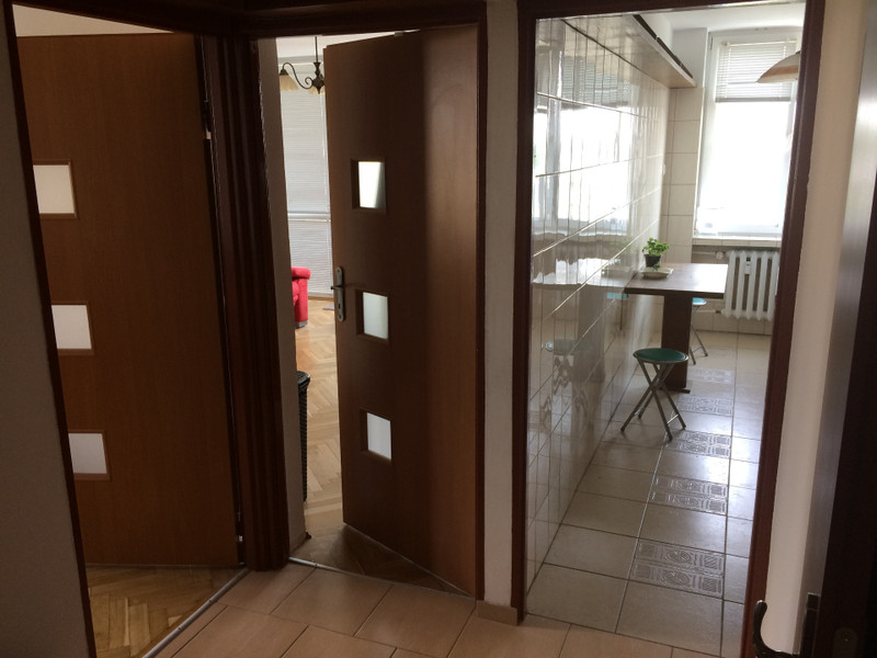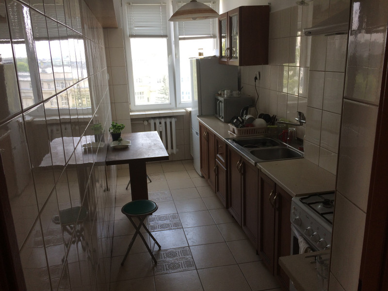 Mieszkanie mieści się na 6 piętrze. W mieszkaniu znajdują się 3 osobne pokoje, łazienka i WC oddzielnie. Do wspólnego użytku w pełni wyposażona widna kuchnia (lodówka, kuchenka gazowa, mikrofalówka, czajnik elektryczny oraz pełna zastawa i przybory do gotowania) oraz przedpokój z dużymi szafami wnękowymi oraz (na wyposażeniu odkurzacz, deska do prasowania).