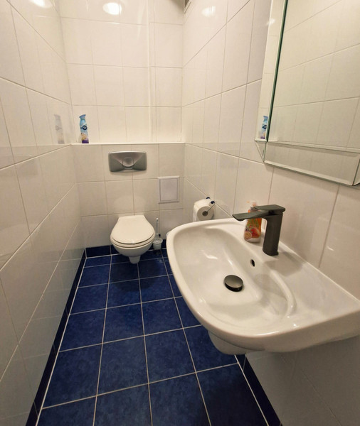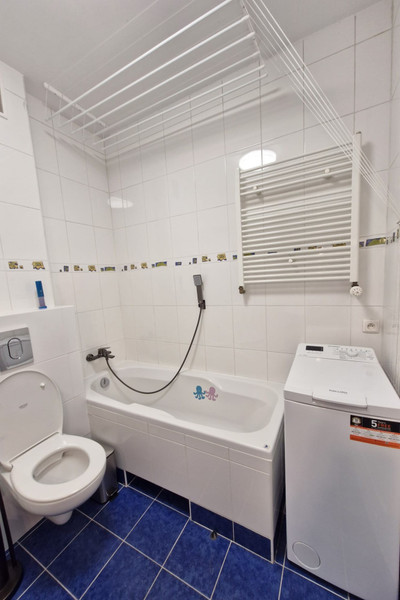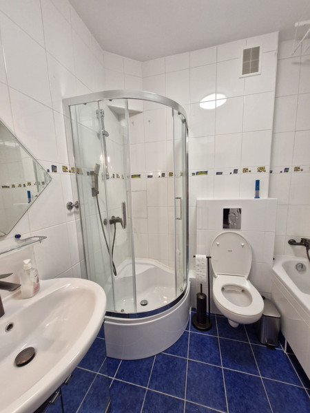 Łazienka z wanną, prysznicem i pralką wc, oddzielne WC.