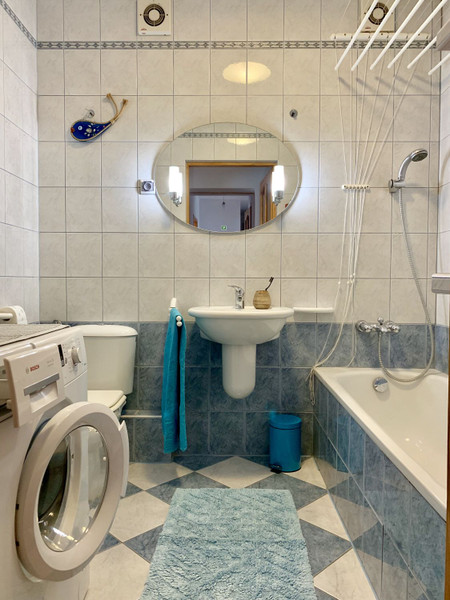 Łazienka 1 – duża wanna, umywalka, toaleta, pralka, suszarka na ubrania, lustro z oświetleniem, ścienne półki na kosmetyki, kaloryfer z dodatkową funkcją grzejnika elektrycznego.