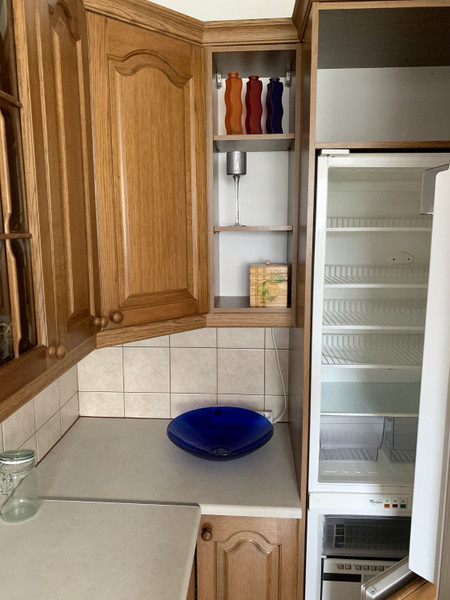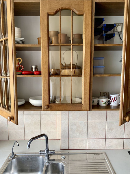 Kuchnia – w pełni umeblowana i wyposażona w sprzęty AGD (piekarnik, płyta ceramiczna, zmywarka, lodówka, zamrażarka, czajnik elektryczny, kuchenka mikrofalowa; wyposażenie kuchenne (nowa zastawa stołowa na 6 osób: talerze, talerzyki, miski, szklanki, kieliszki, sztućce; garnki, patelnie, kubki, deski i noże do krojenia, itd.). Fronty szafek wykonane z eleganckiego, naturalnego dębu.