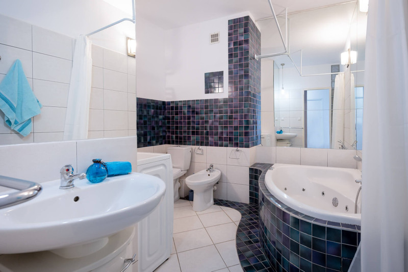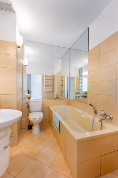 Pokój jest częścią przestronnego, dwupoziomowego apartamentu o powierzchni 160 m². Jest w pełni wyposażony i umeblowany. W mieszkaniu znajdują się dwie wspólne łazienki z wannami i toaletami, a jeden z pokoi posiada własną łazienkę. Całe mieszkanie jest w pełni wyposażone i przygotowane do wynajmu na pokoje. Kuchnia jest bardzo duża, wyposażona w dwie płyty grzewcze, dwie lodówki oraz duży stół, co zapewnia wygodne warunki do przygotowywania posiłków.