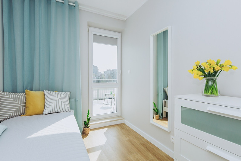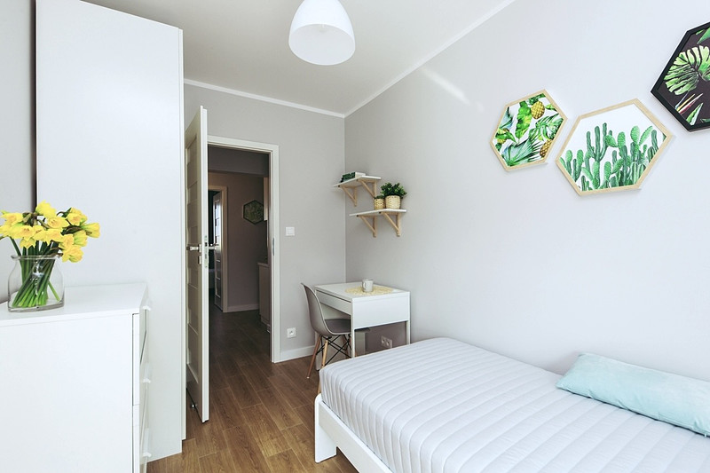 Pokój wyposazony w zestaw mebli, w tym duza szafa PAX z wieszakami, polkami na ubrania i szufladami, komoda, lozko z wygodnym materacem, biurko z krzeslem, duze wiszace lustro.