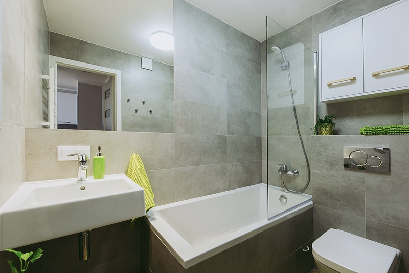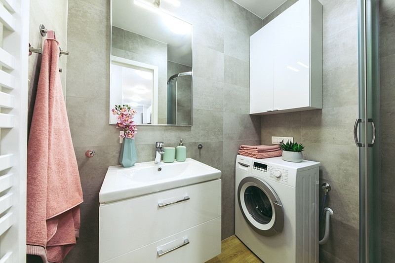 TWO BATHROOMS: with a bathtub and a shower, sinks and a toilet + an additional separate toilet. In the bathrooms there are shelves and cabinets for storing cosmetics.