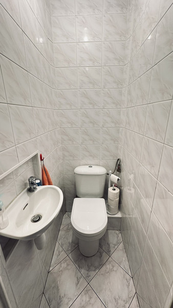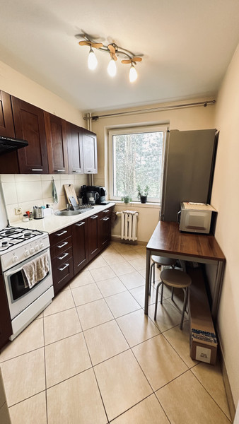 Jasna kuchnia, łazienka oraz oddzielna toaleta.