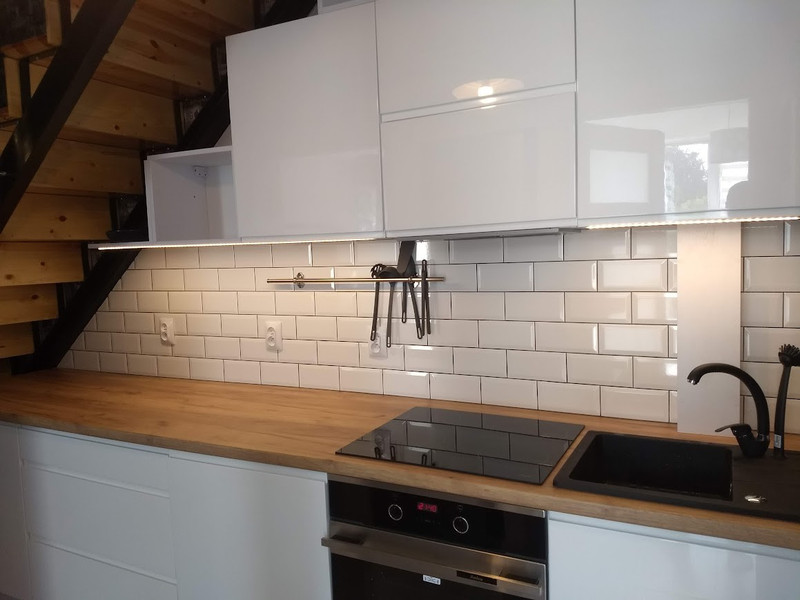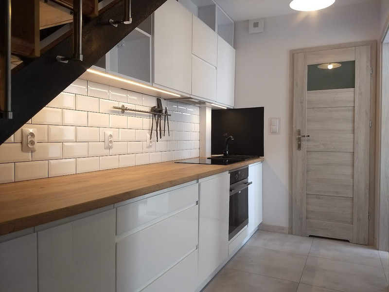 Wyposażenie kuchni, nowe AGD: duża lodówka, płyta indukcyjna, zmywarka, piekarnik, mikrofalówka, czajnik elektryczny, garnki, zastawa.