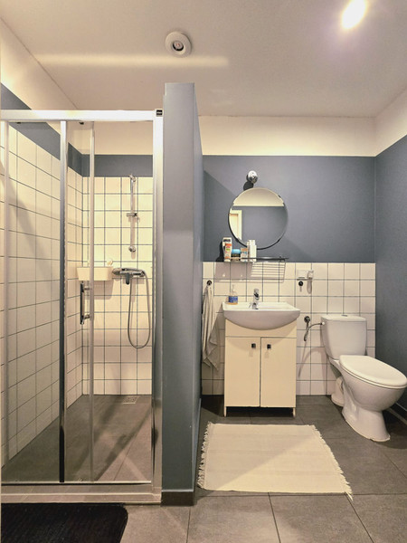 Łazienka posiada prysznic, pralkę, umywalkę i toaletę.
